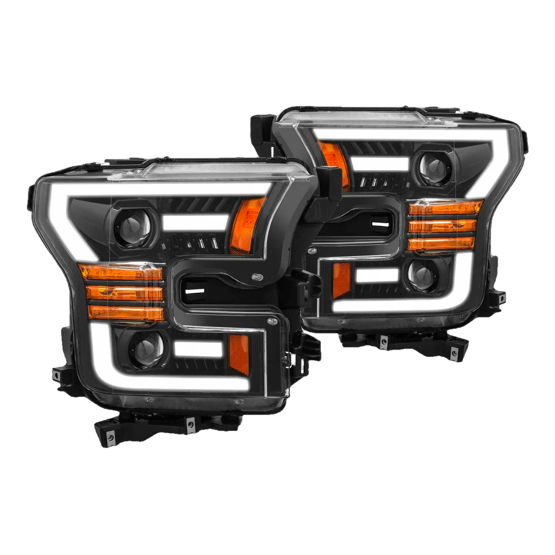 ALPHAREX DESIGN AlphaRex developed the Ford F150 PRO-series headlights based on its stock design and add a LED tube around the edge as a DRL. At the side of these Ford F150 headlights is the amber reflector lens, and there are amber halogen light bulbs at the side for turn signal light as well. These projector headlights are with dual projector design, with the outer projector as low beam, and inner projector as high beam. The headlights use basic H7 halogen bulbs for low beam and another H7 halogen bulb for high beam. You can also upgrade them with a set of high output LED bulbs for even more light on the road.