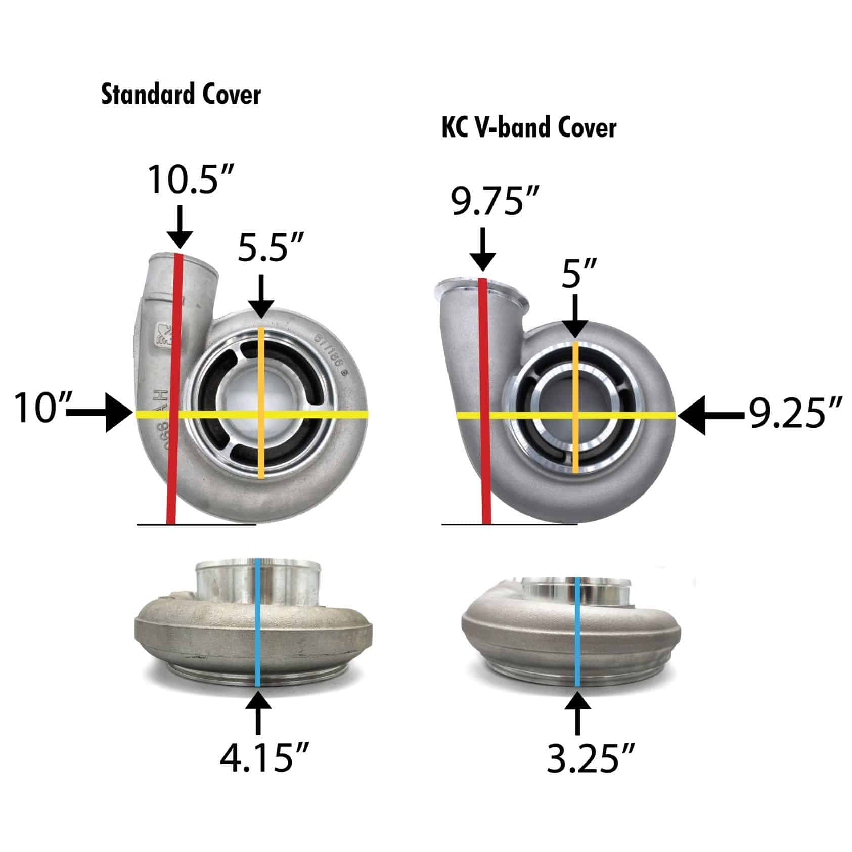 You can add the KC turbos V-band outlet cover to any Borg Warner S467.7 S472 and S476 - 76x87. The standard cover connects to the hot side charge pipe via boot and clamp. This is very prone to burst or rupture at these power levels. In addition, the KC cover is smaller in size and your turbo will more easily fit under the hood in tight places. The new cover has a 5" inlet instead of the standard 5.5" inlet.