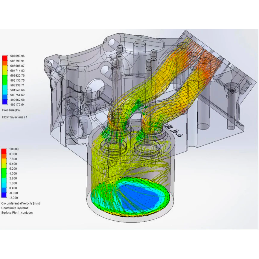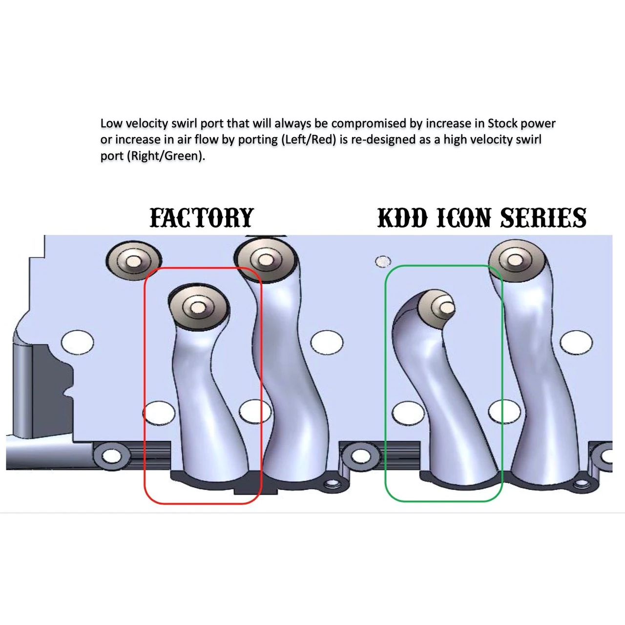Porting the factory heads or aftermarket iron replacement heads has always been a trade off: increase flow but sacrifice swirl...swirl is the preferred mixture motion of a direct injected diesel engine. Ideally the injector should act like a centrifuge, where each fuel vapor droplet is sprayed across bands of swirling air...if each vapor droplet doesn’t continue to find fresh oxygen before the fuel is burned completely, the left over fuel comes out of the exhaust pipe as soot. If that fuel had been burned in cylinder, the engine would have produced more power, with lower EGT, and better turbo spool up and throttle response. They did tons of CFD analysis to determine the best route for port development, to not only maximize airflow, but the cylinder swirl conditions as well.