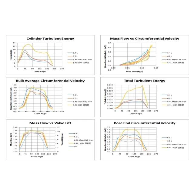 Their testing proved a few things they suspected: their current best flowing heads (iron CNC ported 6.4 heads, 217 cfm on a flow bench) increased total ‘in cylinder’ air mass by a respectable 5.8%, but it also confirmed their suspicions that it murdered cylinder swirl. This is a restraint of the factory casting design geometry, and all other heads previously available on the market...until now all other castings have limited what is possible, while some restrictions are removed with CNC porting of the factory heads, it undeniably kills cylinder swirl. All the fuel in the world doesn’t mean anything if it can’t mix with air. The new cnc ported ICON heads increase (nearly double) cylinder swirl, while increasing in cylinder air mass by a massive 22%, given the same test criteria...our cam profile, 60 psi, 150 degree air temp, etc.